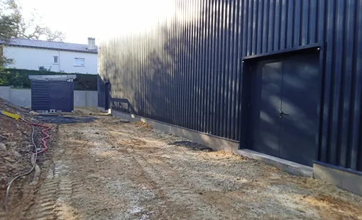 METALFERM a réalisé l'ouverture dans le bardage ainsi que la pose d'un rideau métallique avec chevêtre pour le rajout d'une porte automatique par la suite.